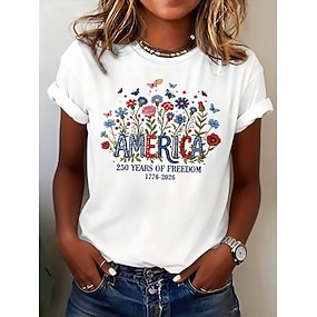 Amerikanischer Unabhängigkeitstag Damen T Shirt Druck Blumen Grafik Flagge Stilvoll Klassisch Lässig Kurzarm Rundhalsausschnitt Rundhals Normale Oberteile Lässig Täglich Weiß Rote Sommer Frühling