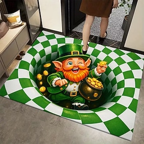 St. Patrick's Day 3D-Fußmatte mit optischem Täuschungseffekt und 2D-Flachdruck: Fröhlicher Kobold mit grün-weiß kariertem Wirbelmuster – perfekt für die festliche Dekoration Ihres Eingangsbereichs.