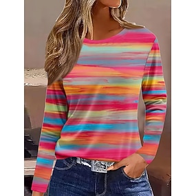 Womens T-Shirt Langarm Grafik Geometrisch Gestreift Vintage Stylish Klassisch Langarm Rundhals Reguläre Tops Tagesdruck Regenbogen Frühling Herbst Winter Vorausherbst