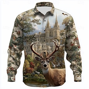 Herren Rentier Architektur Jagd Hemd Knopfhemd Langarm Vintage-Retro Outdoor Campen und Wandern Jagd Frühling Herbst Umlegekragen 3D-Druck Hemden mit Kragen Khaki