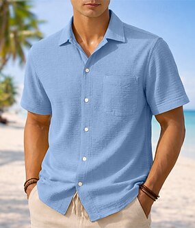 Herren Hemd Textur Freizeithemd Knopfhemd Seersucker-Shirt Blau Dunkelbraun Schwarz Weiß Burgunderrot Kurzarm Einfach Kubanisches Halsband Lässig Täglich Fronttasche Bekleidung Elegant Mode Lässig