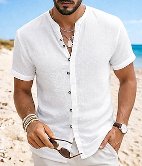 Herren Hemd Leinenhemd Sommerhemd Strandbekleidung Stehkragenhemd Knopfhemd Einfach Lässig Täglich Schwarz Weiß Khaki Grau Kurzarm Mandarinkragen Sommer Bekleidung