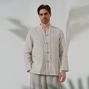 100% Leinen Tasche Herren Hemd leinenhemd Schwarz Weiß Dunkelblau Langarm Glatt Stehkragen Frühling & Herbst Outdoor Täglich Bekleidung