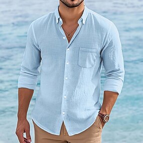 Herren Hemd Leinenhemd Sommerhemd Strandhemd Einfarbig Lässig Urlaub Blau Schwarz Weiß Rosa Langarm Hemdkragen Sommer Frühling Bekleidung Tasche