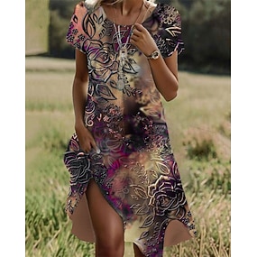 Damen Midikleid Freizeitkleid Sommerkleid Mode Modern Täglich Strand Wochenende Normale Passform Blume Kurzarm Rundhalsausschnitt Purpur Sommer Frühling