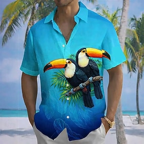 Herren Vogel Papagei Tropische Pflanzen Sommer Hawaiihemd Knopfhemd Alohahemd Kurzarm Lustig Urlaub Strandbekleidung Sommer Frühling Umlegekragen 3D-Druck Hemden mit Kragen Blau