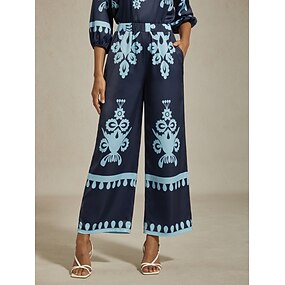 Damenhose mit weitem Bein, seidiger Satin, elastischer Bund, gerade, locker, ethnisch, geometrisch, Platzierungsdruck, lässig, Urlaub, Frühling, Sommer, Herbst