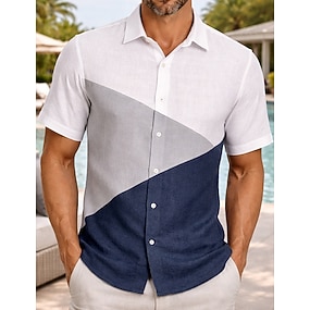 Herren Leinenhemd Sommerhemd Strandbekleidung Knopfhemd Geometrisch Urlaub Lässig Schwarz Weiß Blau Kurzarm Umlegekragen Sommer Frühling Bekleidung Patchwork