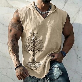 Herren-Weste im Wikinger-Stil mit Yggdrasil-Motiv, nordischem Lebensbaum, Rabenrunen, heidnischem Boho-Stil, ärmellos, Kapuze, Grafik, ausgefranstem Saum, Baumwoll-Leinen-Mischgewebe, lockerer