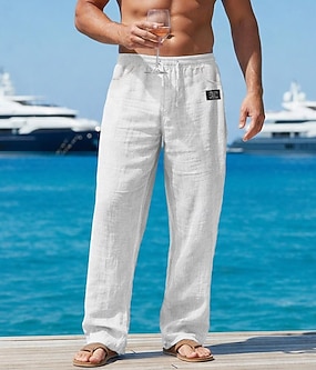 Herren Leinenhosen Hose Sommerhose Strandhose Kordelzug Elastischer Bund Knöpfe Einfach Komfort Atmungsaktiv Volle Länge Lässig Täglich Ferien Mode Klassicher Stil Weiß Blau