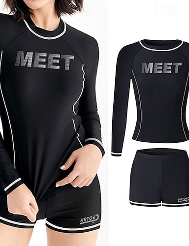 Damen 2-teiliger Rashguard Surfshirt Badeshorts Alphabet UV-Sonnenschutz Schnelltrocknend Langarm Bademode Strand Wassersport Schwimmen Frühling