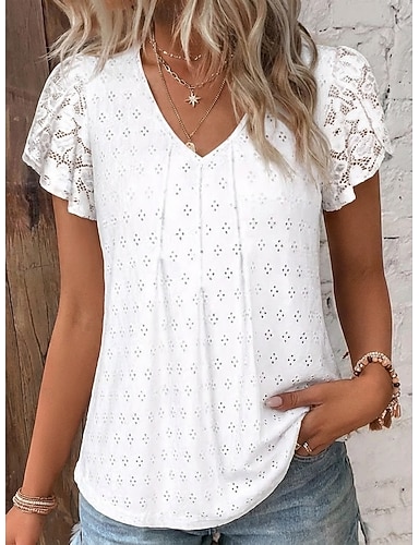 Damen Hemd Bluse Oberteil mit Ösen Spitzentops Spitze Lochmuster Einfach Stilvoll Basic Klassisch Kurzarm V Ausschnitt Normale Oberteile Täglich Ferien Ausgehen Schwarz Weiß Rosa Purpur Grün Sommer