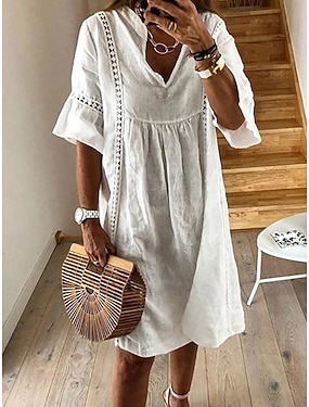 Damen Minikleid Kunstbaumwollleinen Shiftkleid Freizeitkleid Basic Modern Täglich Urlaub Ferien Lässiger Schnitt Einfarbig Halbarm V Ausschnitt Weiß Staubiges Blau Grün Sommer Frühling