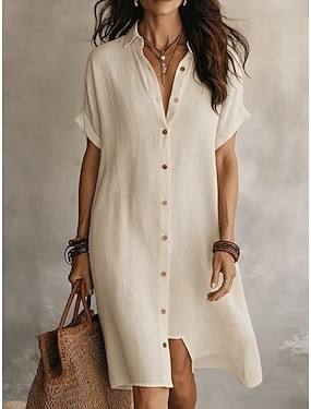 Damen Midikleid Kunstbaumwollleinen A Linie Kleid Lässig Täglich Normale Passform Einfach Kurzarm Revers Beige Sommer Frühling