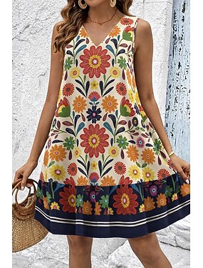 Damen Minikleid Sommerkleid A Linie Kleid Lässig Täglich Ferien Lässiger Schnitt Blumen Grafik Stammes Ärmellos V Ausschnitt Schwarz Beige Sommer Frühling