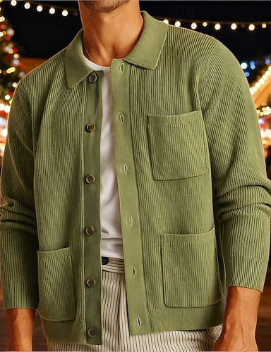 Herren Strickjacke Kurzer Pullover Strickpullover Gerippt Stricken Normale Oberteile Knopf hoch Tasche Einfach Revers Mode Klassisch Urlaub Alltagskleidung Bekleidung Herbst Winter Grün M L XL