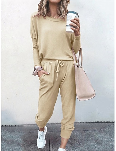 Damen-Schlafanzug, Pyjama-Oberteil und -Hosen-Set, einfarbig, modisch, lässig, weich, für zu Hause, für den Alltag, atmungsaktiv, Rundhalsausschnitt, langärmeliges T-Shirt, Hosentasche, elastische