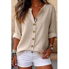 Damen Baumwolle Leinen Bluse Uni Farbe Elegant Casual Kurzarm V-Ausschnitt Regulär Tops Alltag Urlaub Knöpfe Schwarz Blau Lila Grün Beige Sommer Frühling