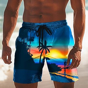Herren Kokospalme Sonnenuntergang Meereswellen Badehosen Badeanzüge Badeshorts Boardshorts Mittlere Taille Hawaiianisch Strandurlaub Seitentaschen Netzfutter Elastischer Kordelzug in der Taille