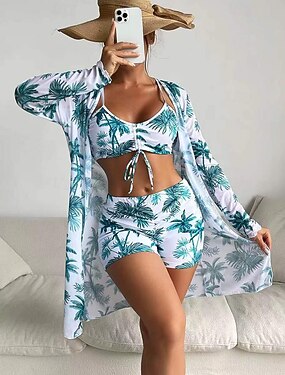 Damen Bikini 3-Teilig Badeanzug Palm Boy Leg Slim Rückenfrei Urlaubs Strandbekleidung Floral Halterneck Ärmellos Lange Ärmeln Bademode