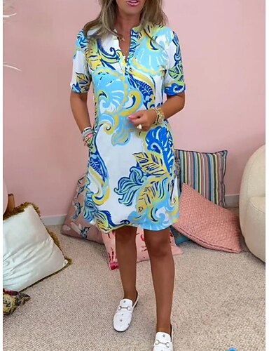 Damen Knielanges Kleid Freizeitkleid Blumenkleid Mode Modern Täglich Outdoor Urlaub Normale Passform Blumen Marmor Kurzarm Rundhalsausschnitt Blau Sommer Frühling