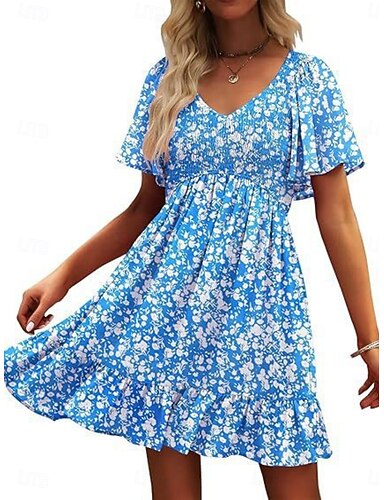 Damen Schwingkleid Druckkleid Midi-Kleid Midikleid Blau Kurze Ärmel Blumen / Pflanzen Kordelzug Drucken Gesmokte Taillenbund Frühling & Sommer V Ausschnitt elegante kleider S M L