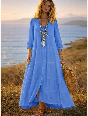 Damen Maxikleid Kunstbaumwollleinen Hemdblusenkleid Sommerkleid Kaftan Kleid Urlaub Basic Modern Täglich Wochenende Lässiger Schnitt Einfach Dreiviertelarm V Ausschnitt Blau Weiß Gelb Sommer Frühling
