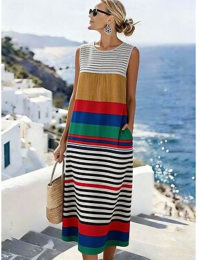 Damen Midikleid Freizeitkleid Sommerkleid Shiftkleid Elegant Mode Klassisch Täglich Outdoor Urlaub Normale Passform Geometrisch Gestreift Ärmellos Rundhalsausschnitt Blau Sommer Frühling
