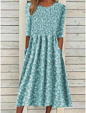 Damen Kleid-Set Sommerkleid Lässig Blumen Druck Midikleid Dreiviertelarm Rundhalsausschnitt Täglich Outdoor Blau Rosa Grün Sommer Frühling Normale Passform