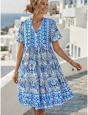 Damen Minikleid Boho-Kleid Vintage-Kleid Freizeitkleid Elegant Mode Modern Outdoor Urlaub Ausgehen Normale Passform Lässiger Schnitt Grafik Kurzarm V Ausschnitt Blau Weiß Gelb Rosa Sommer Frühling