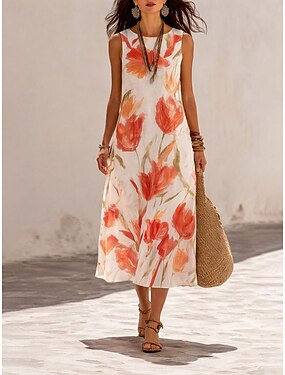 Damen Midi Kleid Leinenähnliches Sommerkleid Shift Kleid A-Linien Kleid Urlaub Freizeit Boho Strand Party Ausgehen Lockere Passform Floral Grafik Ärmelos Rundhalsausschnitt Blau Grau Rosa Beige