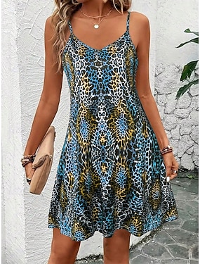 Damen Minikleid A Linie Kleid Unterkleid Schulterfreies Kleid Urlaub Lässig Urlaub Täglich Normale Passform Grafik Leopard Ärmellos V Ausschnitt Blau Königliches Blau Purpur Grün Sommer