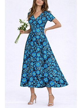 Damen Maxikleid Freizeitkleid Druckkleid Elegant Mode Modern Outdoor Strand Urlaub Lässiger Schnitt Grafik Kurzarm V Ausschnitt Blau Sommer Frühling