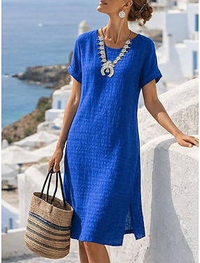 Damen Midikleid Kunstbaumwollleinen Shiftkleid Freizeitkleid Basic Klassisch Lässig Täglich Outdoor Urlaub Normale Passform Einfach Dreiviertelarm V Ausschnitt Blau Weiß Grün Sommer Frühling Herbst