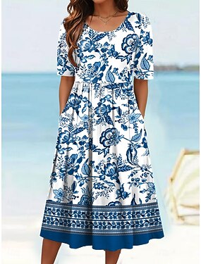 Damen Freizeitkleid Blumendruck Rundhals Midikleid Stilvoll Casual Täglich Urlaub Kurzarm Sommer