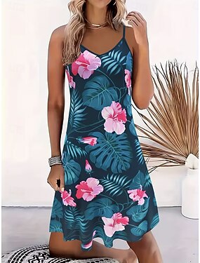 Damen Strandkleid Blumenblattdruck Spaghettiträger Minikleid Basic Casual Alltag Urlaub Ärmellos Sommer Frühling