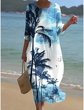 Damen Maxi Kleid Leinenartige Sommerkleid Shift Kleid Urlaub Lässig Strand Ausgehen Lockere Passform Floral Grafik Blatt 3/4-Ärmel Rundhals Blau Weiß Grau Sommer Frühling Herbst
