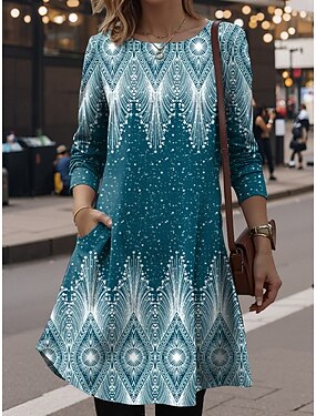Damen Minikleid Shiftkleid Pulloverkleid Party Lässig Boho Ferien Ausgehen Normale Passform Grafik Geometrisch Langarm Rundhalsausschnitt Blau Königliches Blau Leicht Braun Himmelblau Frühling Herbst