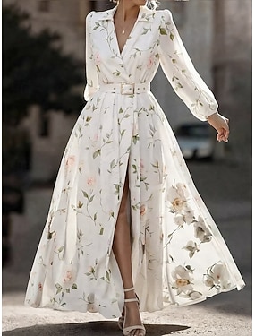 Damen Maxikleid Chiffonkleid Schwingkleid Blumenkleid Druckkleid Elegant Mode Modern Outdoor Urlaub Ausgehen Normale Passform Blumen Langarm V Ausschnitt Weiß Sommer Frühling