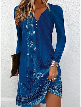 Damen Minikleid Blumenkleid Druckkleid Mode Modern Täglich Urlaub Ausgehen Normale Passform Blumen Langarm V Ausschnitt Blau Weiß Sommer Frühling