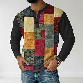 Karierter Pullover für Herren, grafisches Hemd, Farbblock, Modedesigner, Basic, 3D-Druck, Waffelmuster, Henley, lässiger Stil, klassischer Outdoor-Alltags-T-Shirt, lange Ärmel, geometrisches Muster,