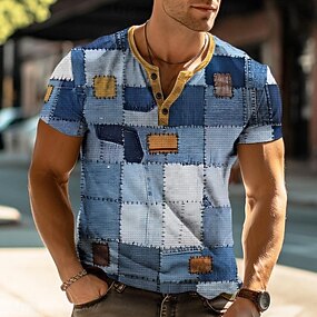 Herren Patchwork T Shirt Henley Hemd Kurzarm T-Shirt 3D-Druck Henley Hemd Designer Retro Vintage Straße Lässig Täglich Blau Braun Grün Sommer Frühling Ganzjahres Bekleidung S M L XL 2XL 3XL