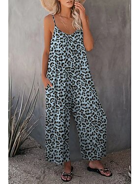 Damen Normal Overall Streetwear Leopard Ärmellos U-Ausschnitt Tasche Druck Straße Ausgehen Normale Passform Weiß Rosa Blau Herbst