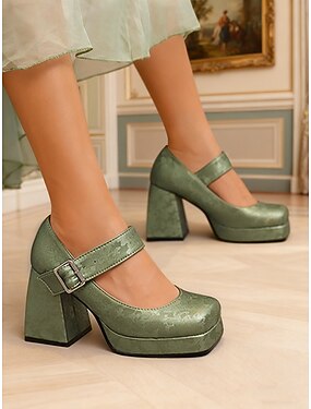 Grüne Mary-Jane-Plateau-Pumps mit Blumenmuster aus Kunstleder für Damen mit Schnalle – Vintage-Pumps mit klobigem Blockabsatz im Stil der 1950er-Jahre für formelle Anlässe, Partys und Hochzeiten