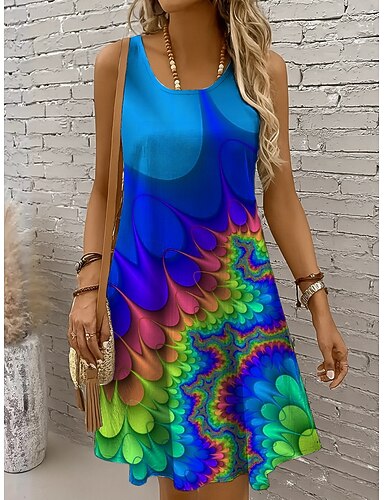Damen Normal Minikleid A Linie Kleid Trägerkleid Sommerkleid Urlaub Stilvoll Lässig Urlaub Täglich Normale Passform Grafik Geometrisch Ärmellos Rundhalsausschnitt Blau Sommer
