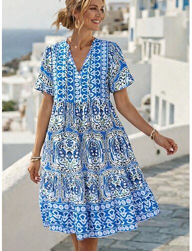 Damen Knielanges Kleid Boho-Kleid Hemdblusenkleid Elegant Bohemien Ethnisch Strand Ferien Lässiger Schnitt Grafik Geometrisch Kurzarm Stehkragen Blau Rosa Orange Sommer Frühling