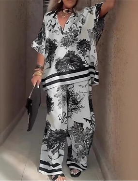 Damen Aktiv Bluse Hosen-Sets Kurzarm Rundhalsausschnitt Blumen Druck Ferien Alltagstauglich Schwarz Khaki Sommer Normale Passform