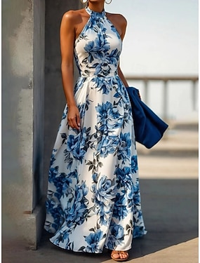 Damen Maxikleid A Linie Kleid Halterkleid Urlaub Lässig Outdoor Ausgehen Lässiger Schnitt Blumen Ärmellos Neckholder Blau Sommer Frühling