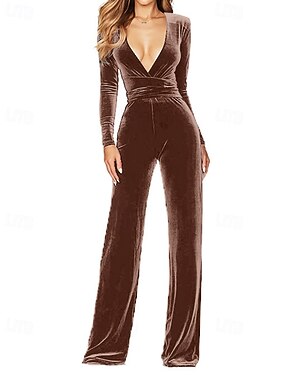 Damen Overall Aktiv Einfarbig Langarm Weites Bein V Ausschnitt Mit Gürtel Urlaub Party Normale Passform Blau Schwarz Wein Frühling