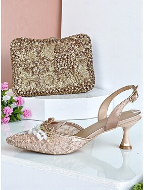 Champagnerfarbenes Set mit Strass-Stilettos und Clutch für Damen – elegante High Heels mit spitzer Spitze für Hochzeiten, Abschlussbälle und Abendpartys